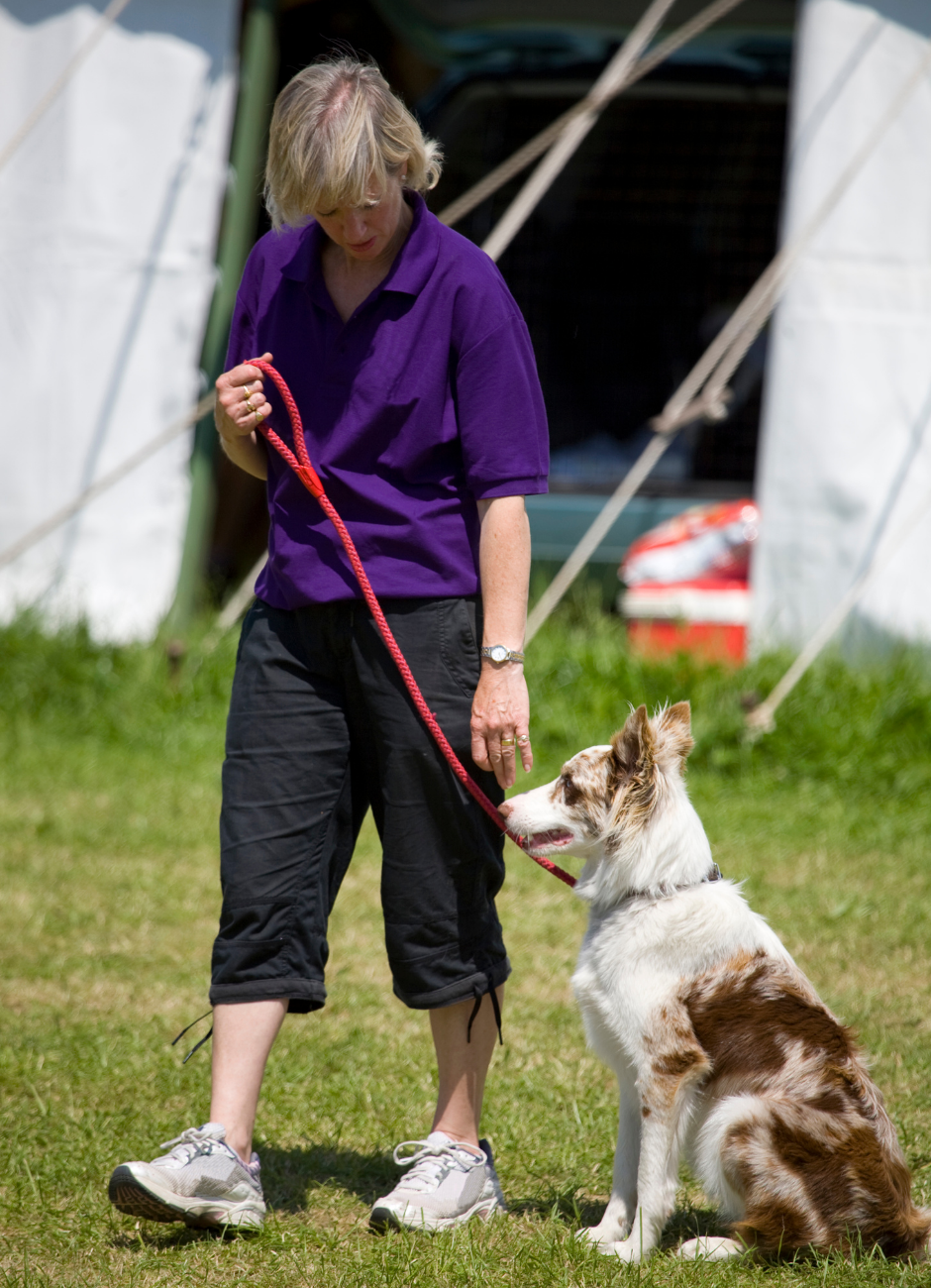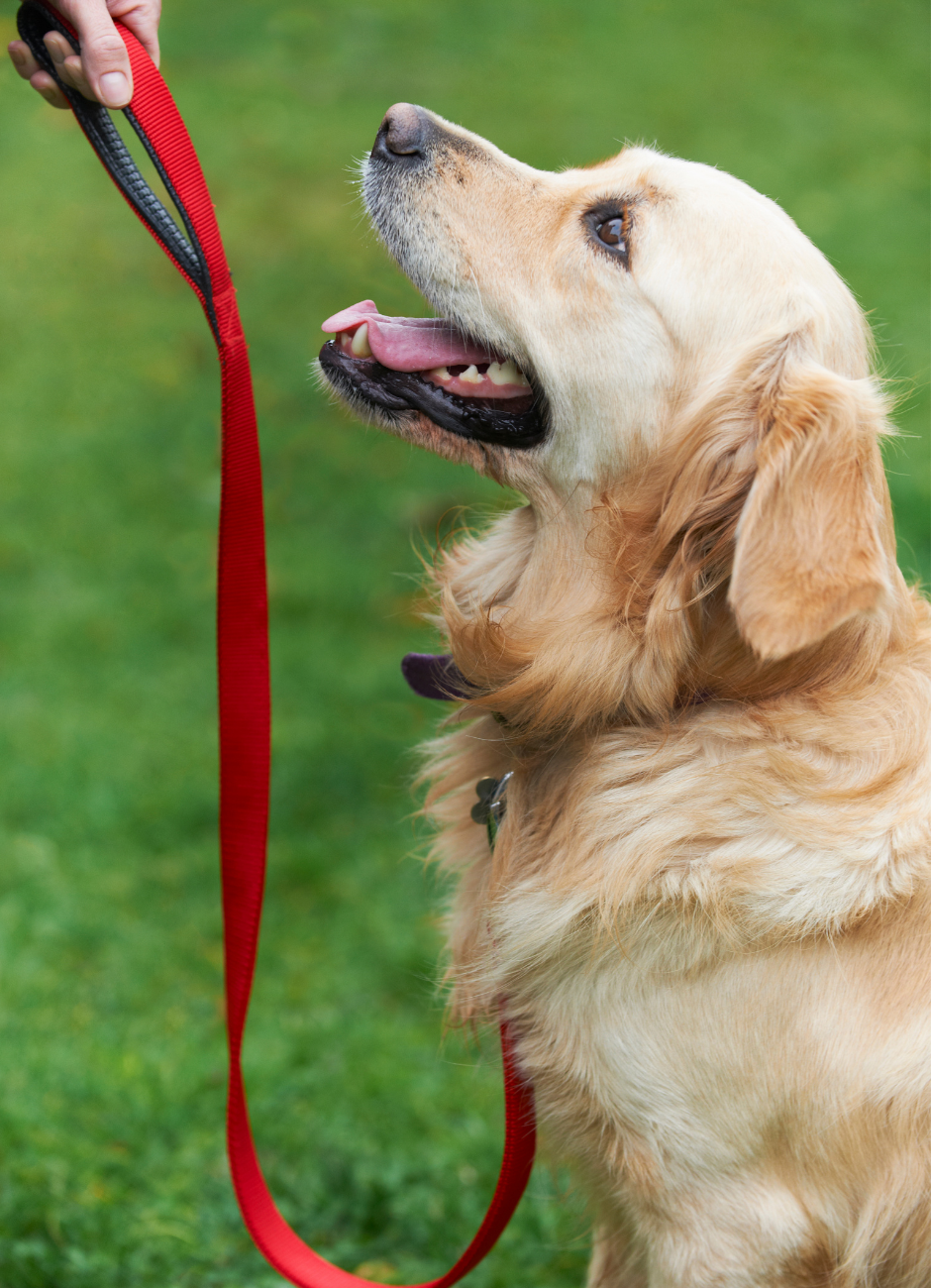 A standard leash, a comfortable harness or flat collar, and high-value treats. We often recommend a long line for controlled practice and distance work.